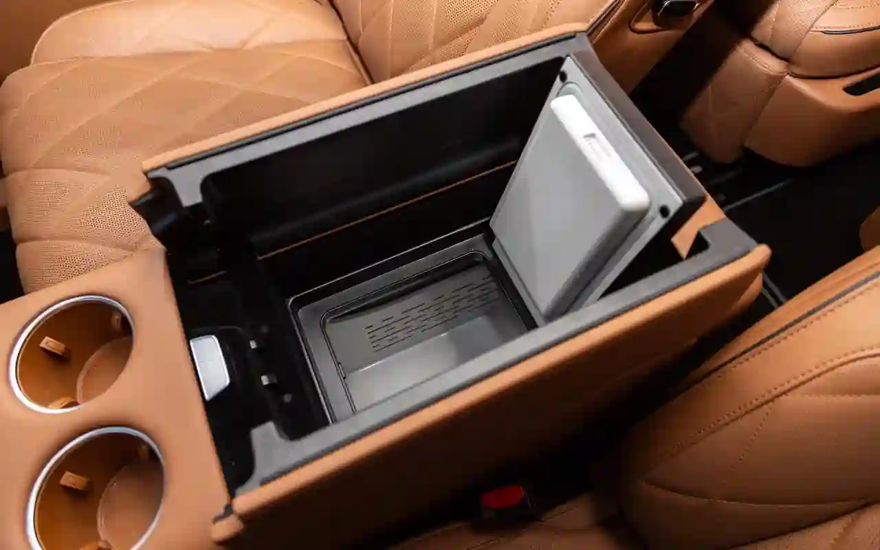 К слову, есть холодильник и портативная «микроволновка». Конечно, шутим, но отчасти. Вместительный отсек под подлокотником водителя не только охлаждает, но и греет: саке или шампанское для вип-пассажира всегда будет правильной кондиции.